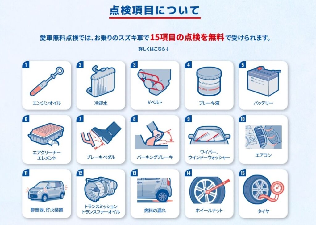 ※2024年以降の登録・届出車両およびスズキ安心メンテナンスパック加入者は愛車無料点検の対象外とさせていただきます。