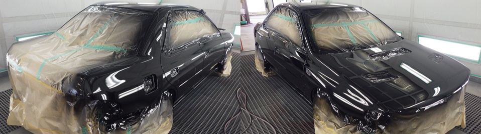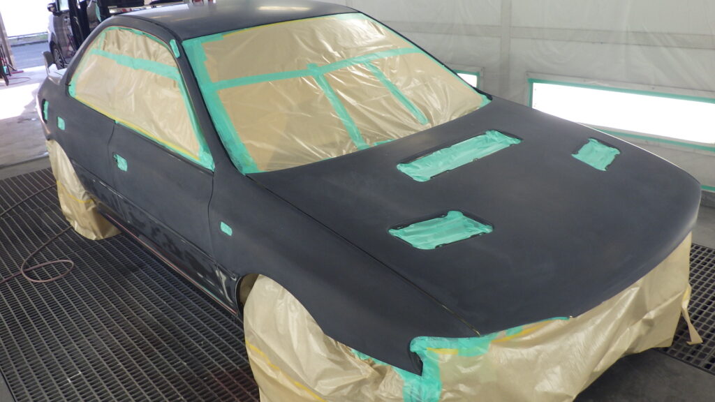 鈑金等下処理やサフェーサー塗布も終え、塗装ブースに入れいよいよ本塗装を行います。既に外した前後バンパーやエアダクト等小物類は塗装済みです。