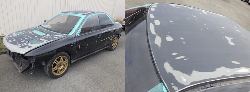今でも根強い人気車 インプレッサWRX のご入庫です。経年車では避けては通れない塗膜の劣化でご入庫いただきました。これから先も乗り続けたいとのご希望で再塗装でのリフレッシュです。